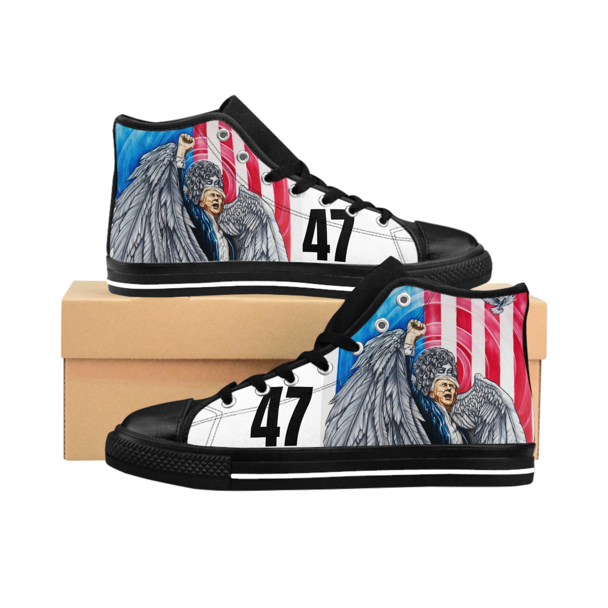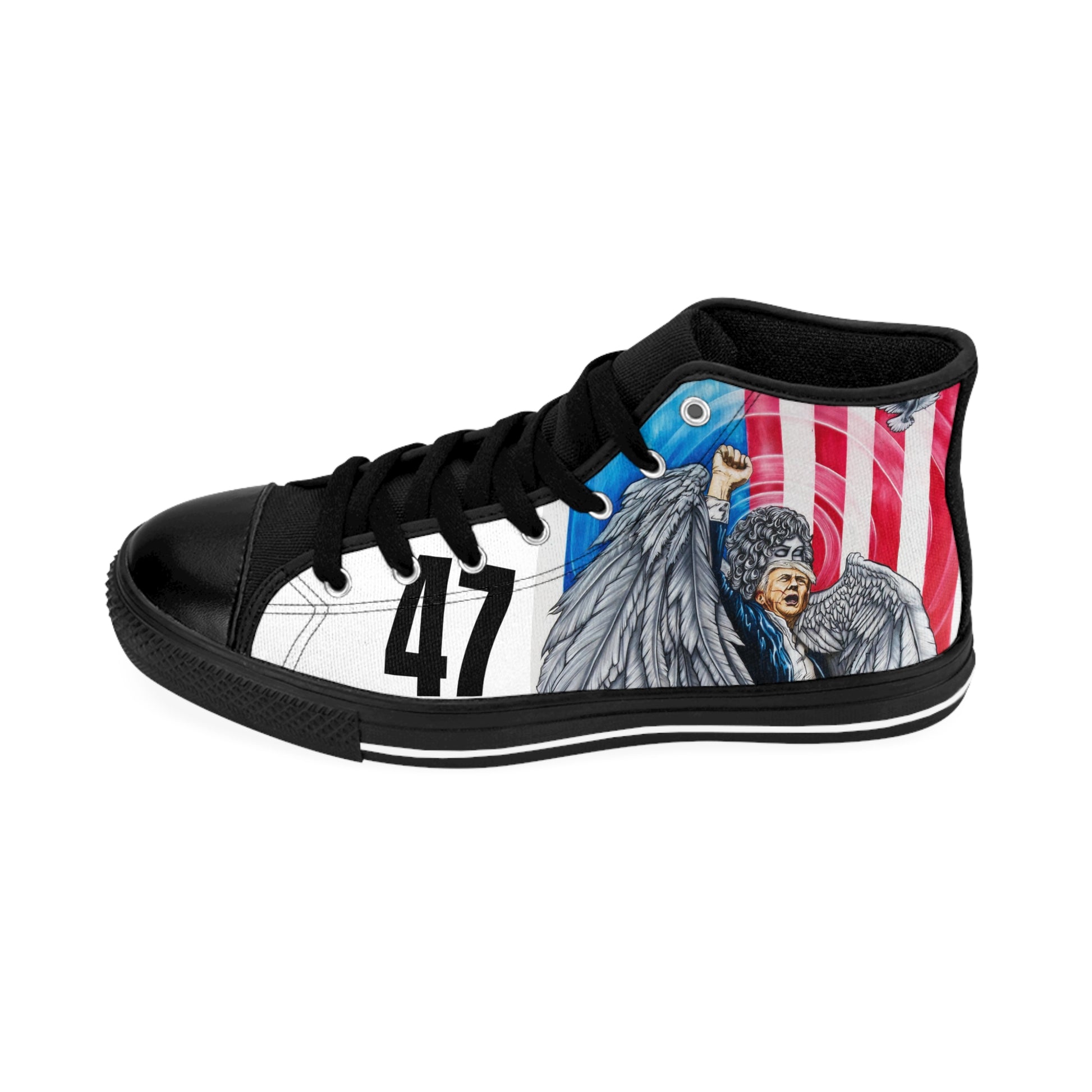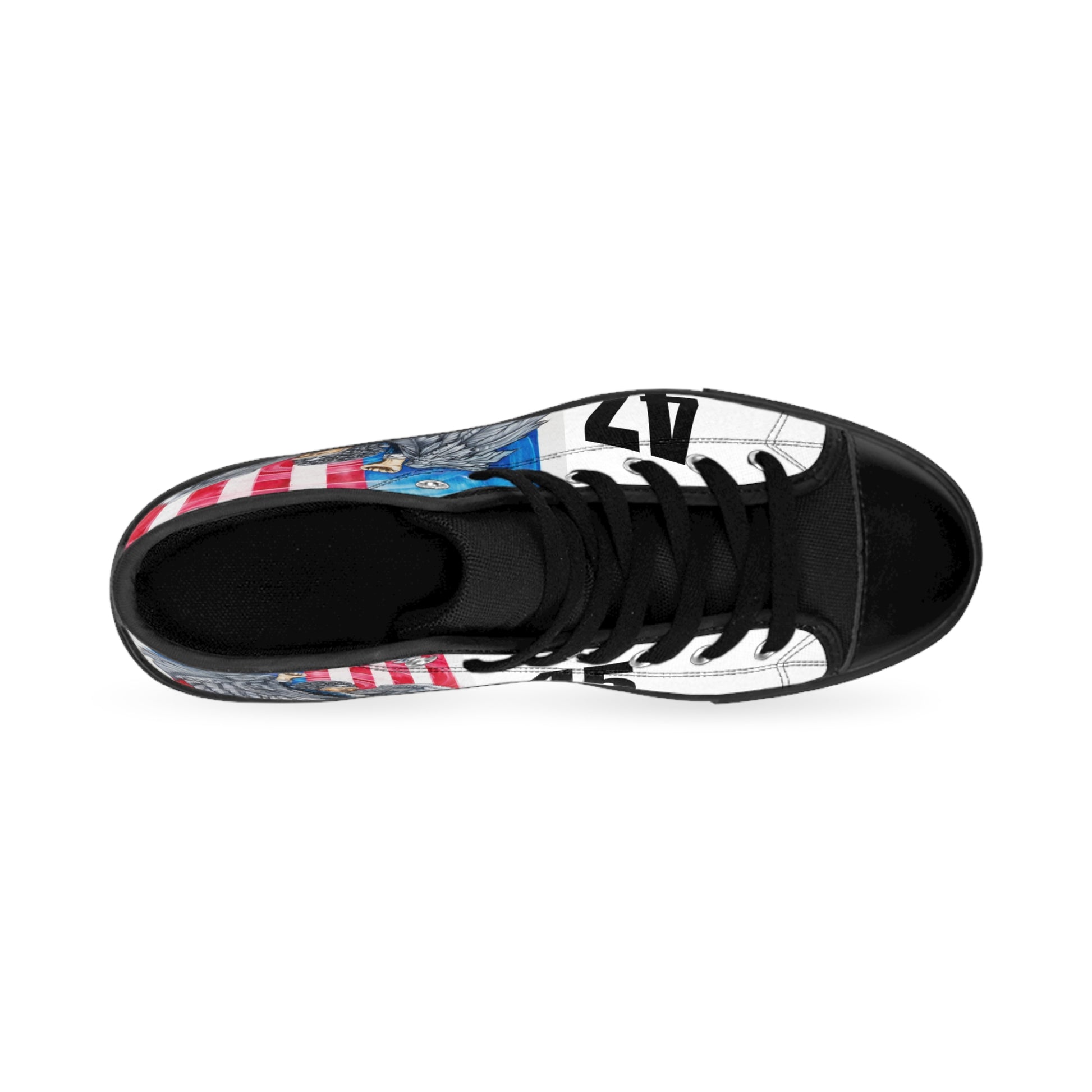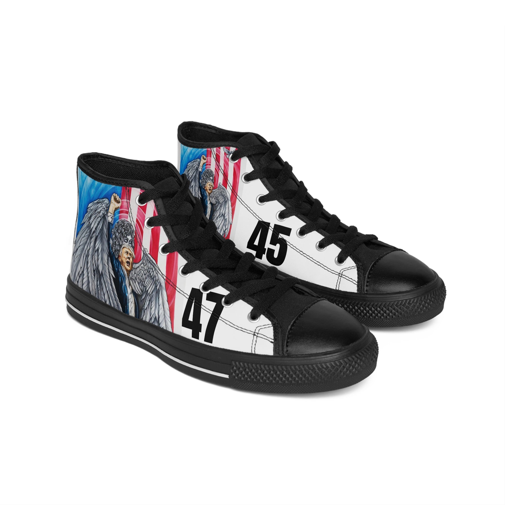 In honor of DJT 45th-47th POTUS and his unrelenting desire to lead America to Greatness! These extremely comfortable high-top classic sneakers with a high quality print are made to last and to impress - a truly original way to express oneself and inspire new fashion trends on the go.